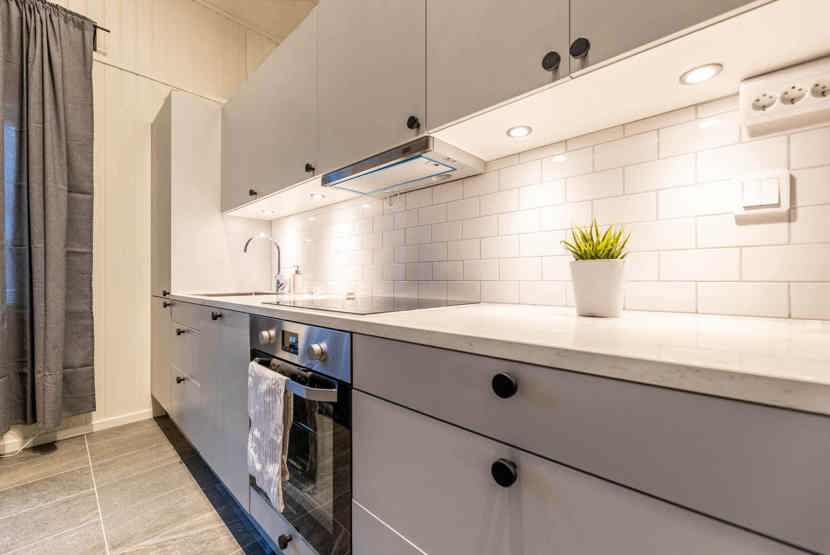 Køkkenet indeholder: elkomfur med ovn, køleskab, frys, opvaskemaskine.