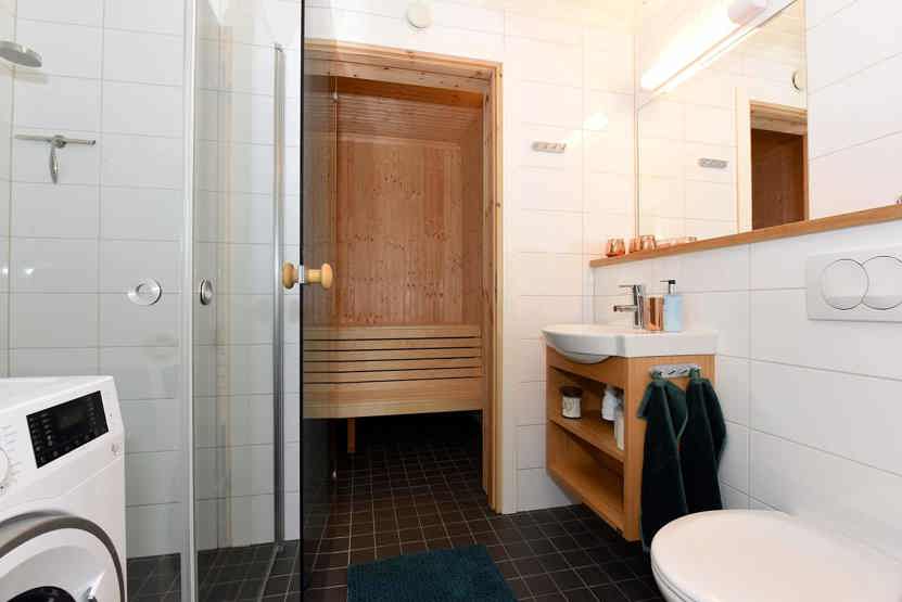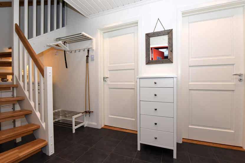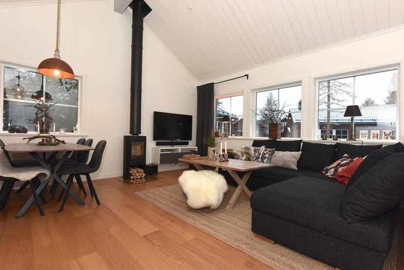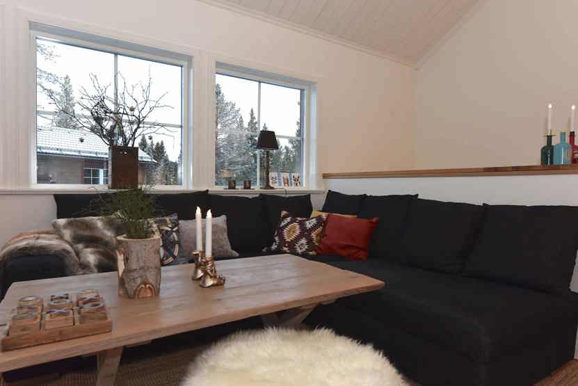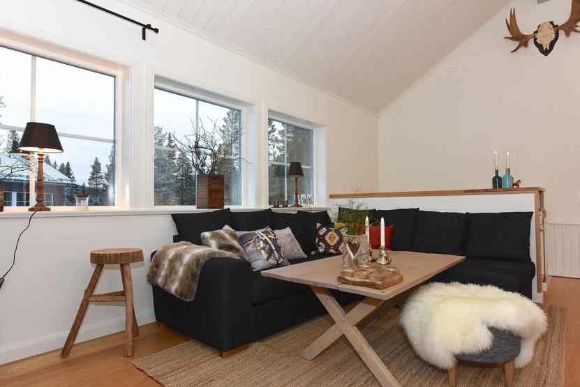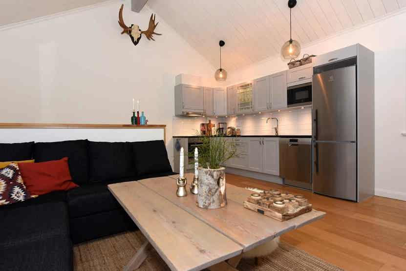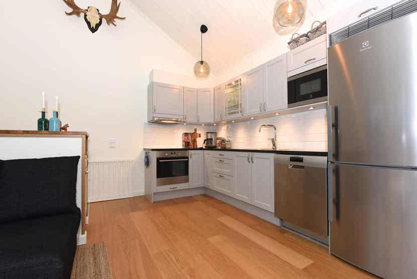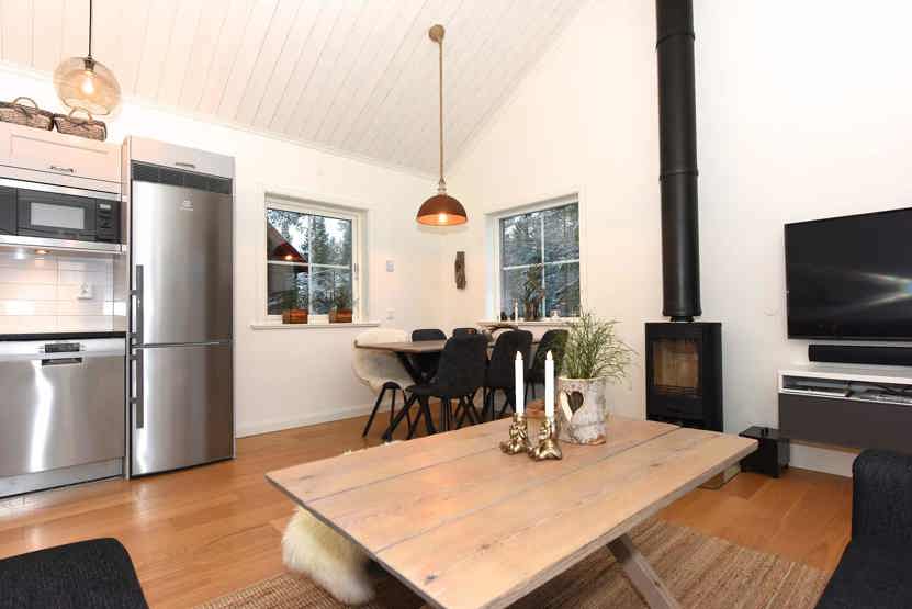 Opholdsstue med køkkenafdeling. TV, brændeovn (brænde indgår ikke), tørreskab, vaskemaskine, altan (skovles ikke), rum til skiudstyr.