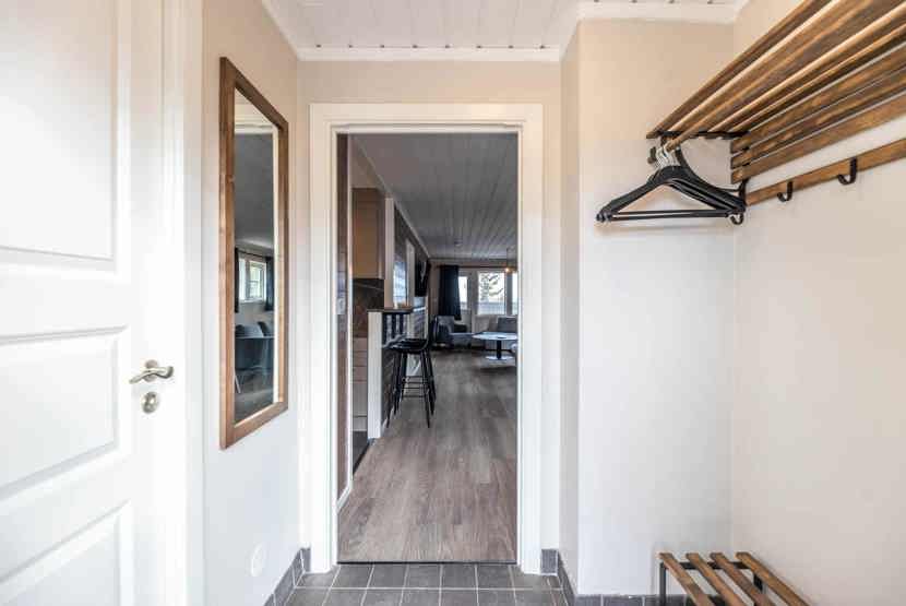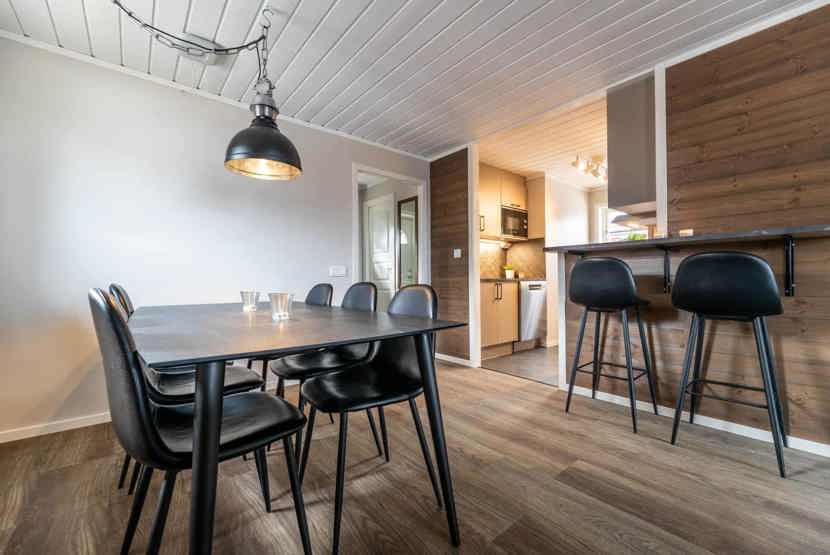 Opholdsstue med køkkenafdeling. TV, brændeovn (brænde indgår ikke), balkon, tørreskab, rum til skiudstyr.