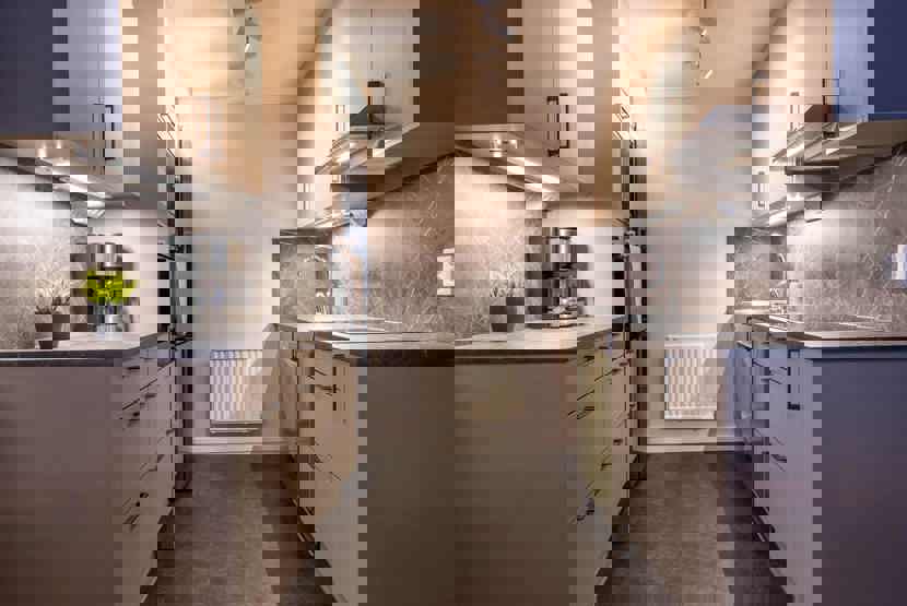 Køkkenet indeholder: elkomfur med ovn, microovn, køleskab, frys, opvaskemaskine.