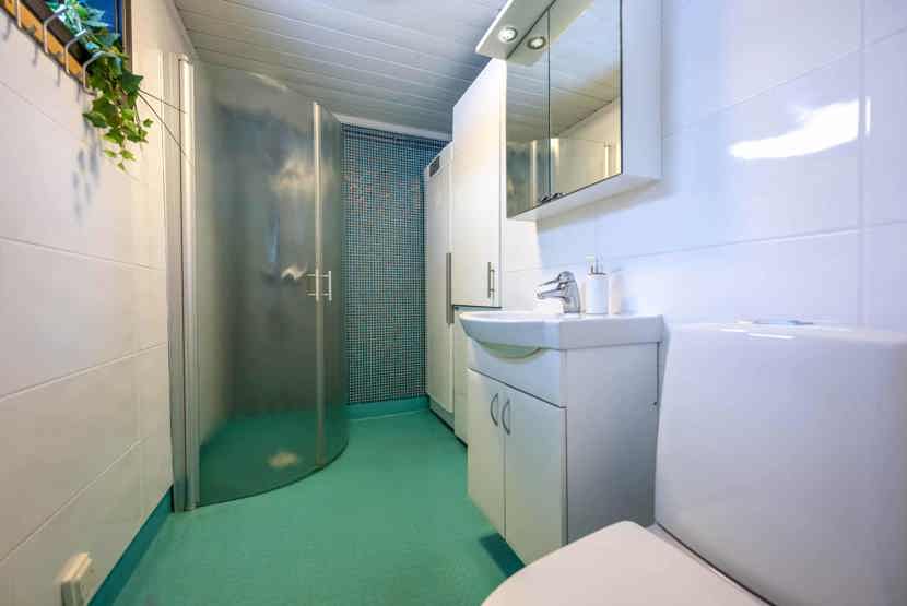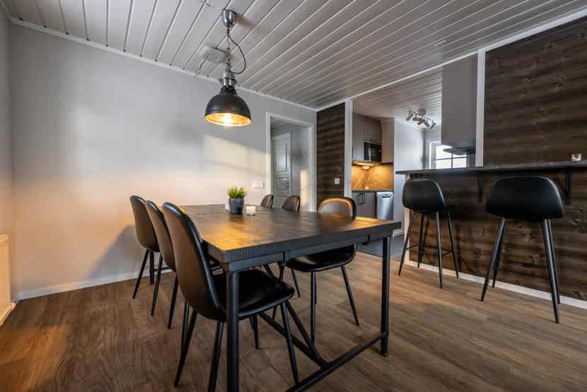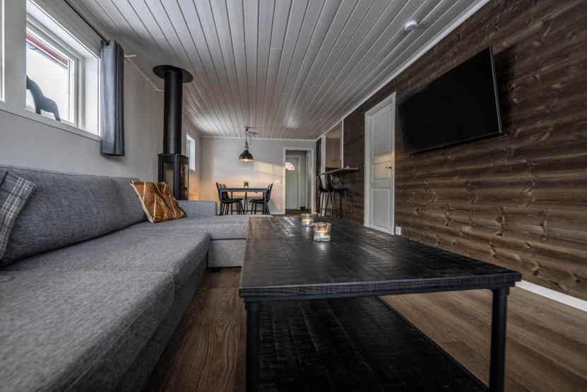 Opholdsstue med køkkenafdeling. TV, tørreskab, brændeovn (brænde indgår ikke), rum til skiudstyr, balkon.