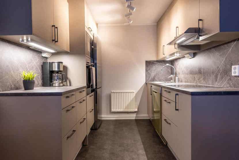 Køkkenet indeholder: elkomfur med ovn, microovn, køleskab, frys, opvaskemaskine.