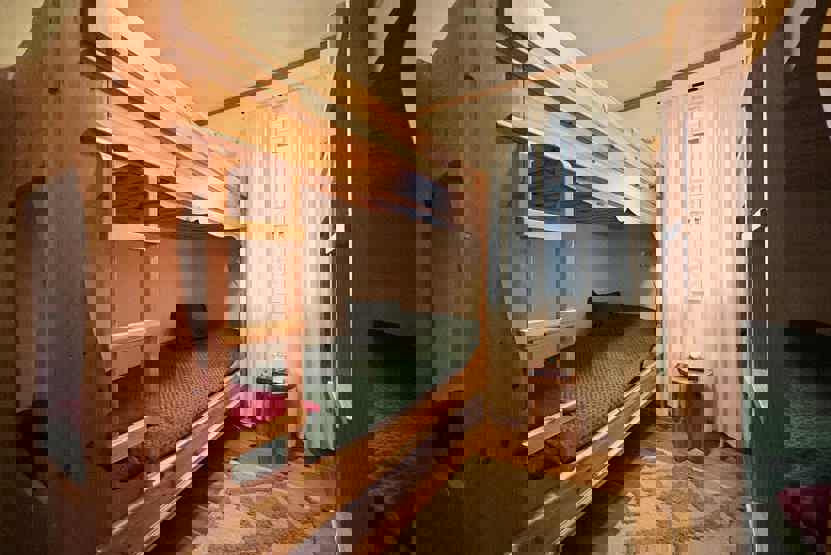 Soveværelse-1= 1 dobbeltseng 160 cm bred. Soveværelse-2= 2 køjesenge hvor både over og underkøje er 80 cm bred.