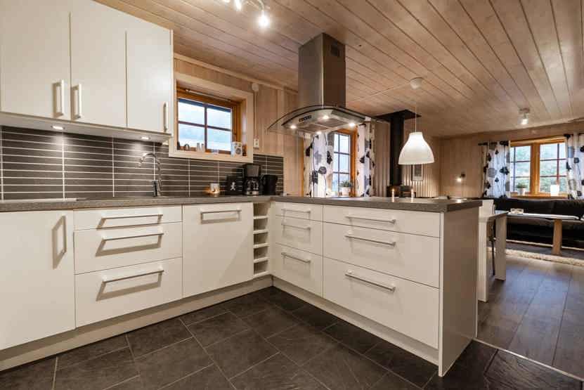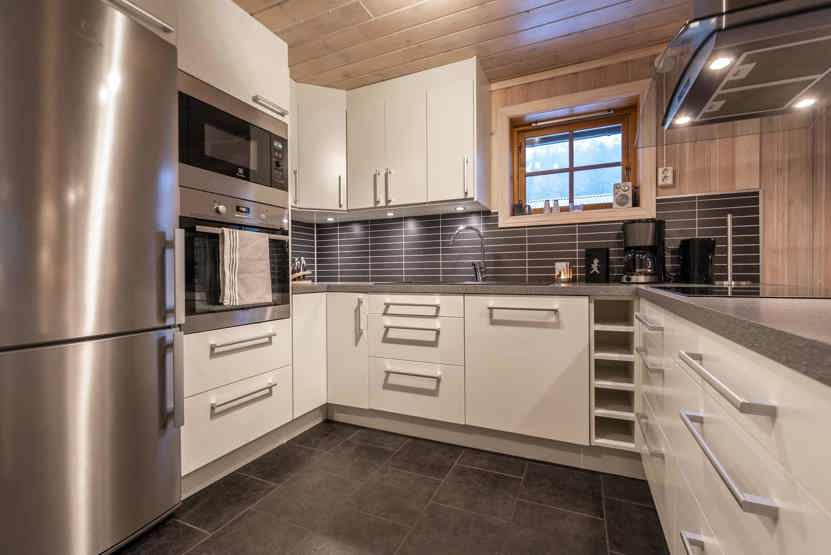 Køkkenet indeholder: kogeplade, indbygningsovn, køleskab, microovn, frys, opvaskemaskine.
