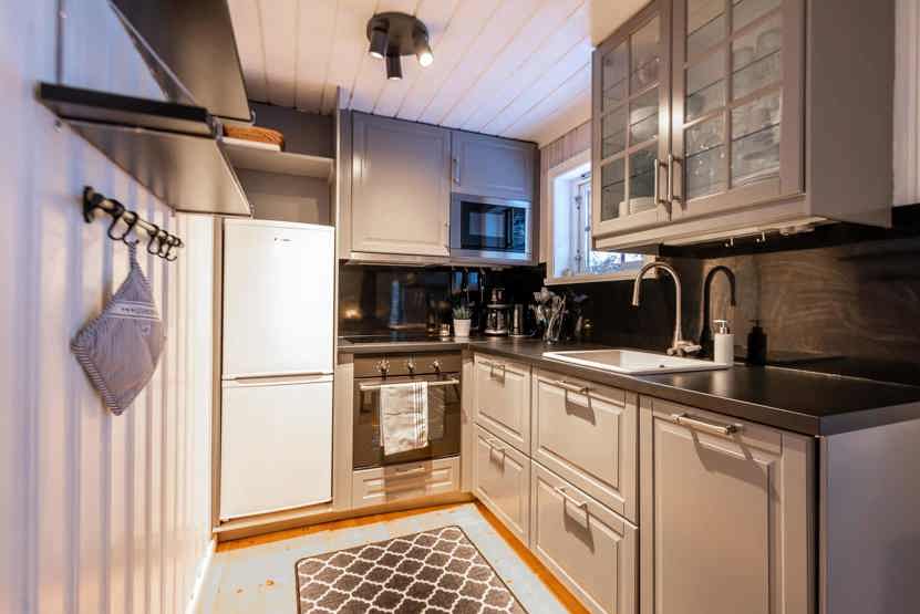 Køkkenet indeholder: elkomfur med ovn, køleskab, frys, microovn, opvaskemaskine.