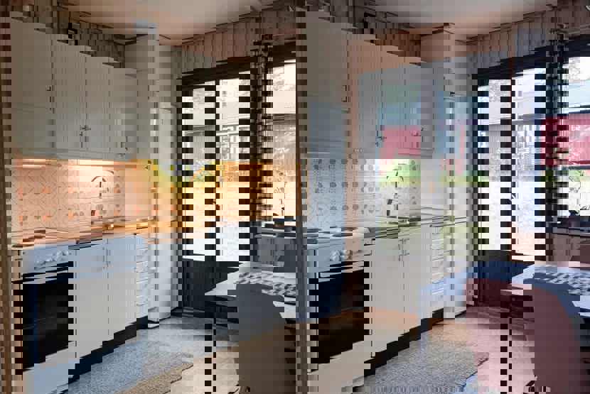 Køkkenet indeholder: elkomfur med ovn, køleskab, frys, microovn.