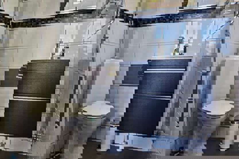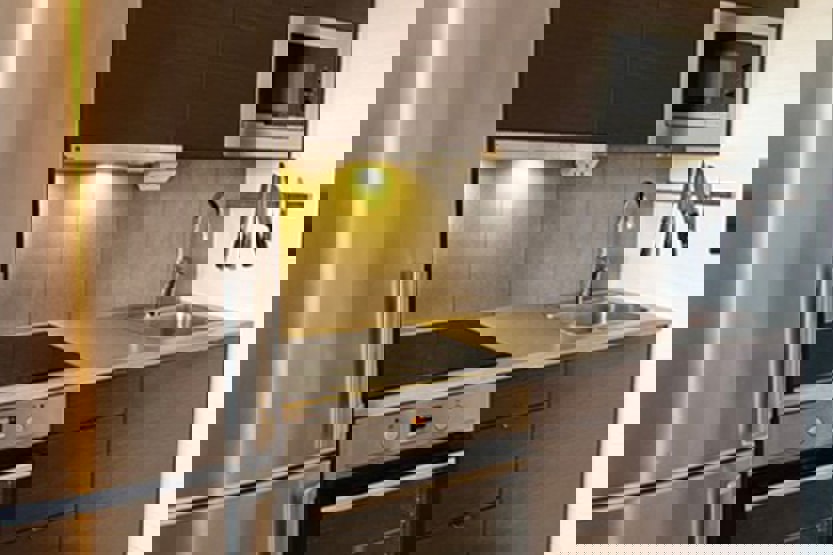 Køkkenet indeholder: keramiske kogeplader med ovn, køl/frys, microovn.