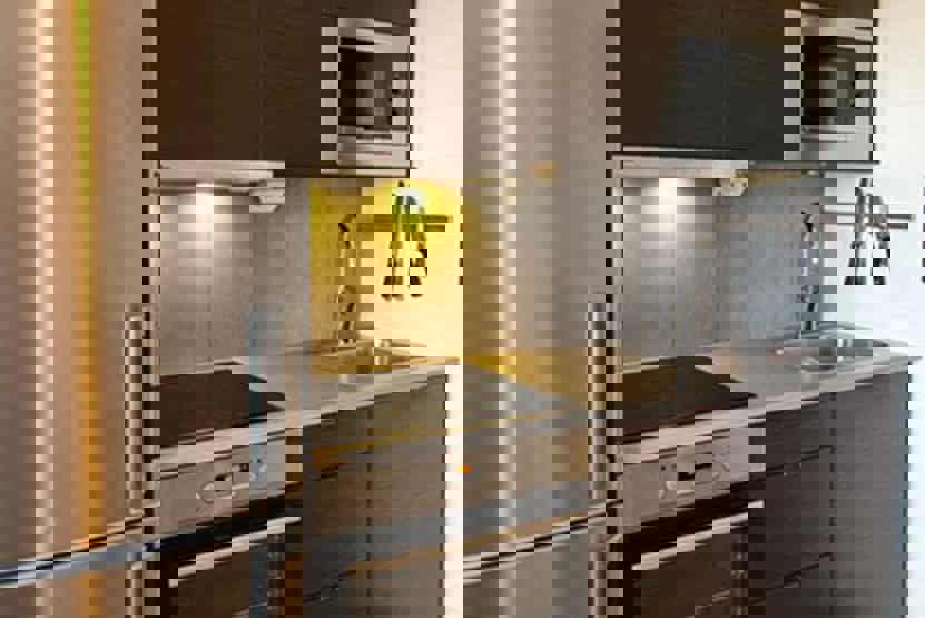 Køkkenet indeholder: keramiske kogeplader med ovn, køl/frys, microovn, opvaskemaskine.