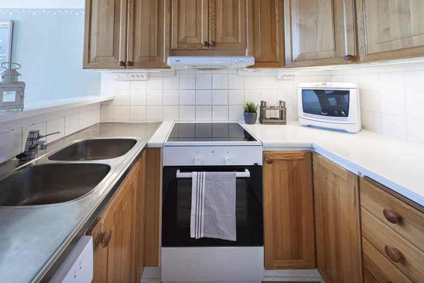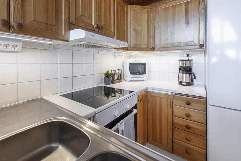 Køkkenet indeholder: elkomfur med ovn, køleskab, frys, opvaskemaskine, microovn.