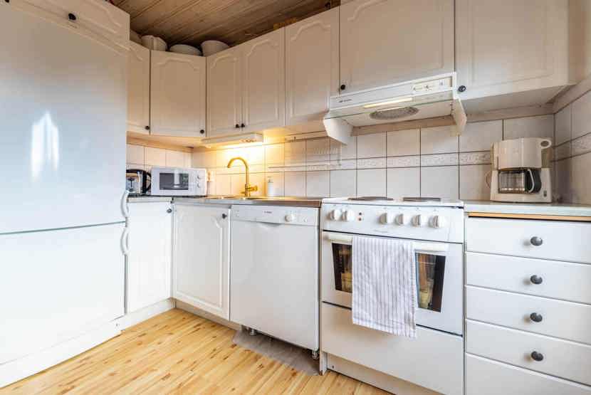 Køkkenet indeholder: elkomfur med ovn, køl med frys, opvaskemaskine, microovn.