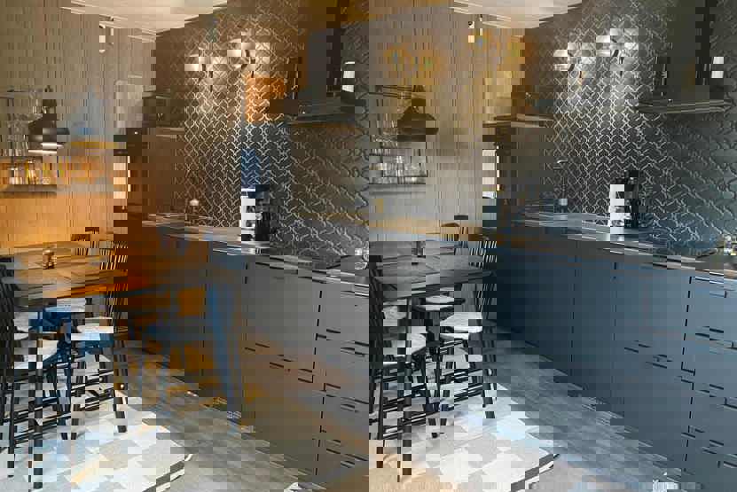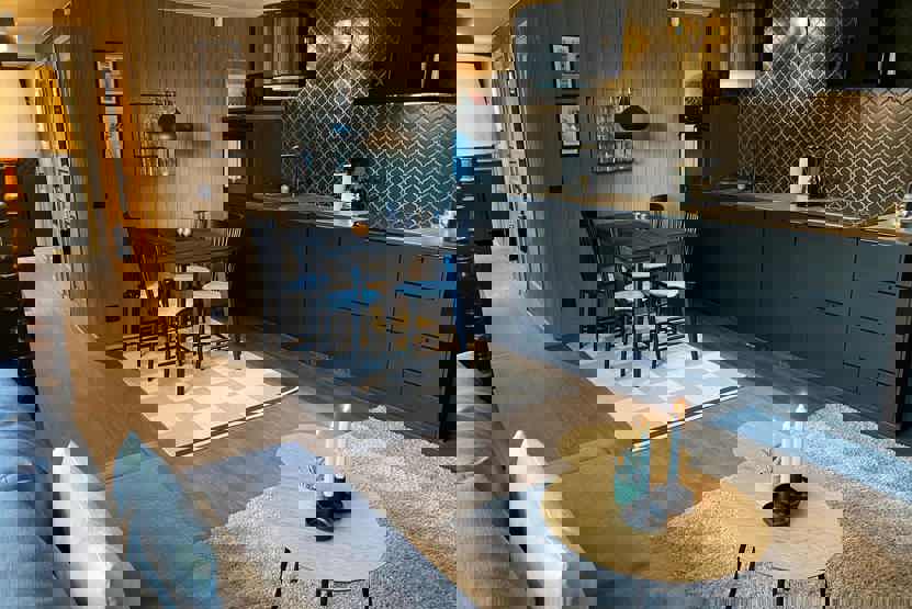 Køkkenet indeholder: elkomfur med ovn, køl med frys, opvaskemaskine, microovn.