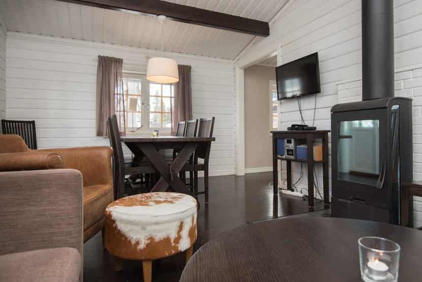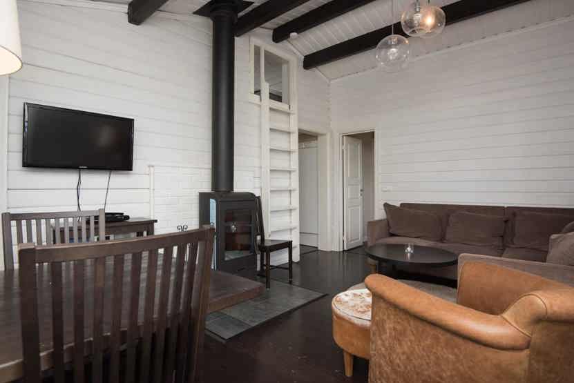 TV, tørreskab, brændeovn (brænde indgår ikke), altan (skovles ikke), På soveloftet findes to ekstra senge, som ikke er medregnet i sengeantallet på grund af stejl stige til loftet