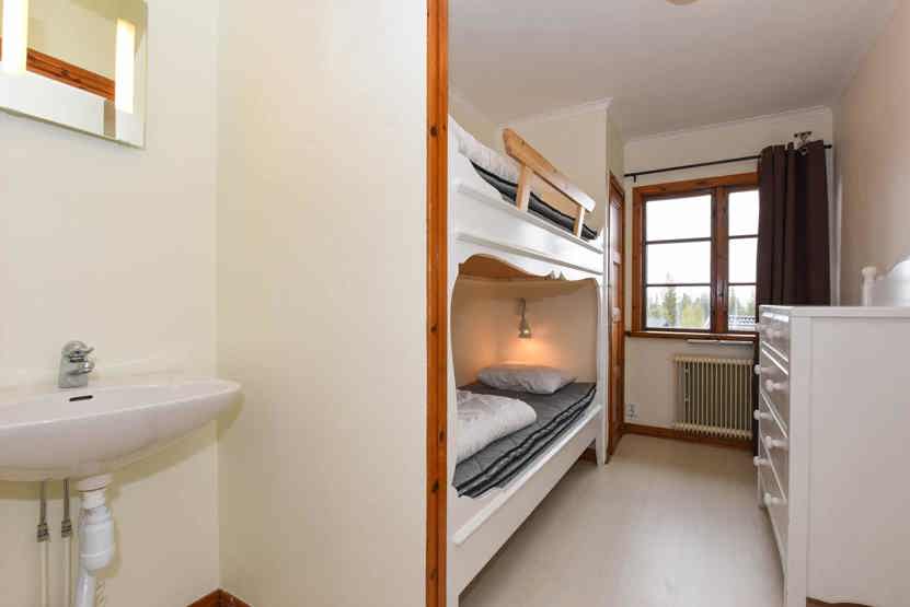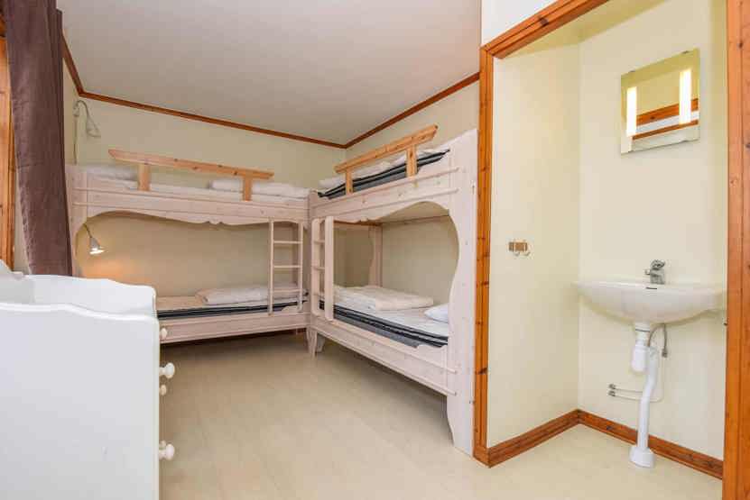 Soveværelse-1= 1 køjeseng. Soveværelse-2= 1 køjeseng. Soveværelse-3= 1 køjeseng. Soveværelse-4= 1 dobbeltseng. Soveværelse-5= 3 køjesenge. Soveværelse-6= 1 køjeseng, Tvättställ finns i varje sovrum.