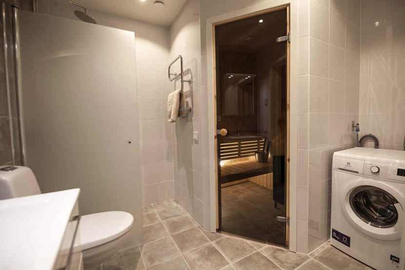 Badeværelset-1 = bruse/wc/sauna. Badeværelset-2 = bruse/wc/håndklædetørrer.