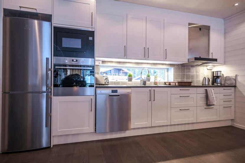 Køkkenet indeholder: keramiske kogeplader, indbygningsovn, køleskab, frys, opvaskemaskine, microovn.