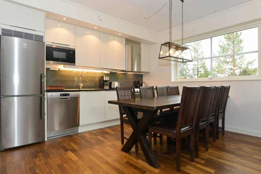 Køkkenet indeholder: keramiske kogeplader, indbygningsovn, microovn, køleskab, frys, opvaskemaskine.