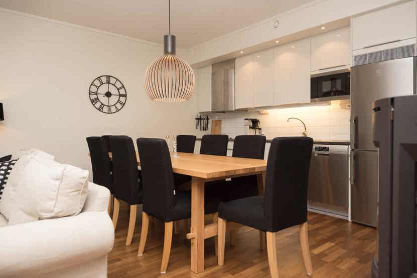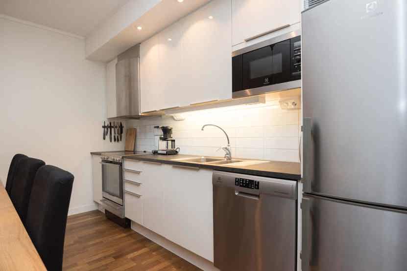 Køkkenet indeholder: keramiske kogeplader, indbygningsovn, microovn, køleskab, frys, opvaskemaskine.