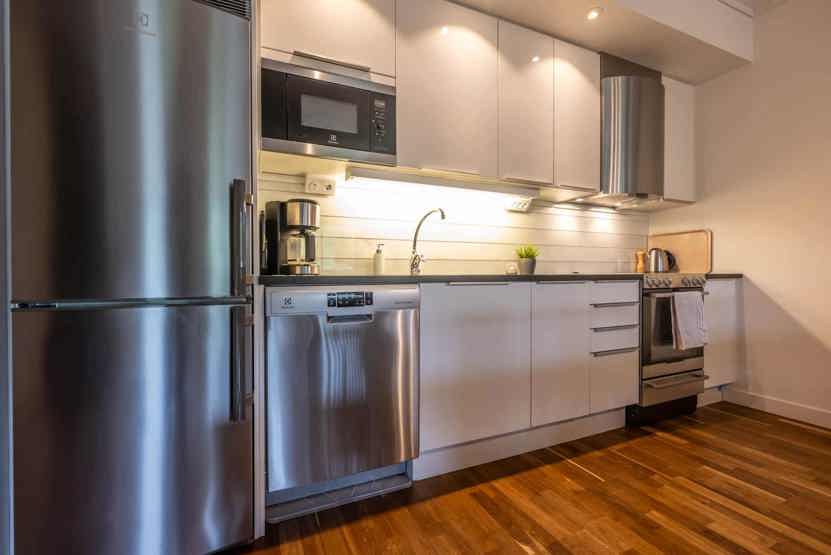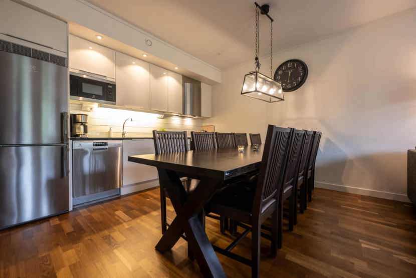 Køkkenet indeholder: keramiske kogeplader, ovn, microovn, køleskab, frys, opvaskemaskine.