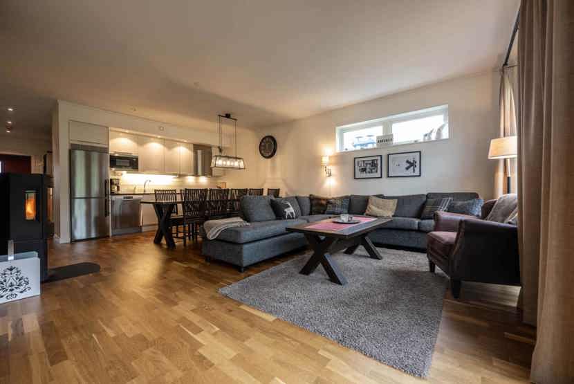 TV, brændeovn (brænde indgår ikke), vaskemaskine, tørreskab, balkon, havem¢bler, rum til skiudstyr, 1 parkeringsplads.