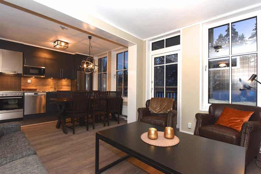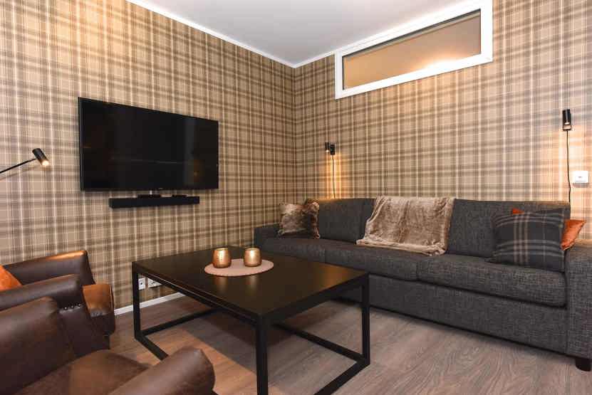 Opholdsstue med køkkenafdeling. TV, tørreskab, rum til skiudstyr.