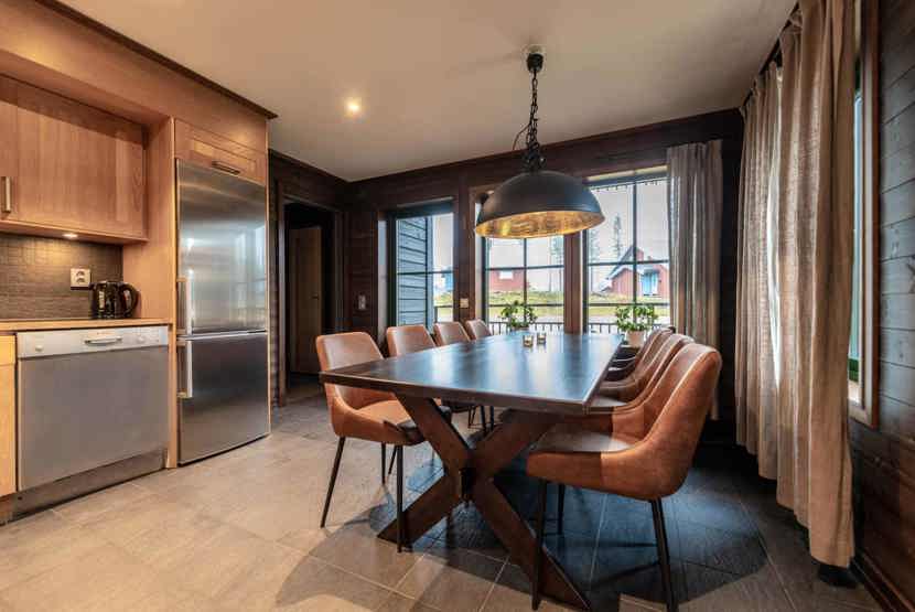 Opholdsstue med køkkenafdeling. TV, brændeovn (brænde indgår ikke), tørreskab, vaskemaskine, rum til skiudstyr, balkon.