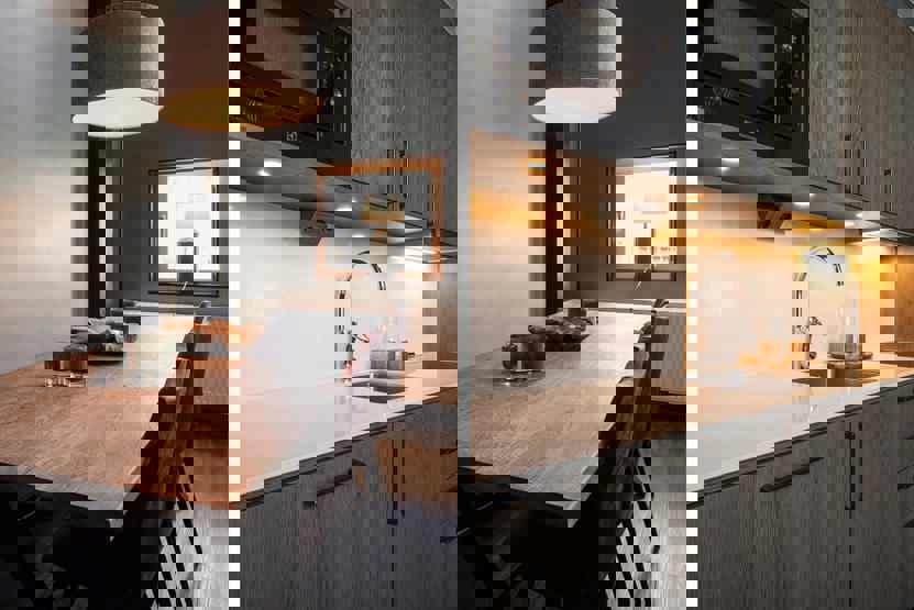 Køkkenet indeholder: keramiske kogeplader med ovn, køl/frys, opvaskemaskine, microovn.