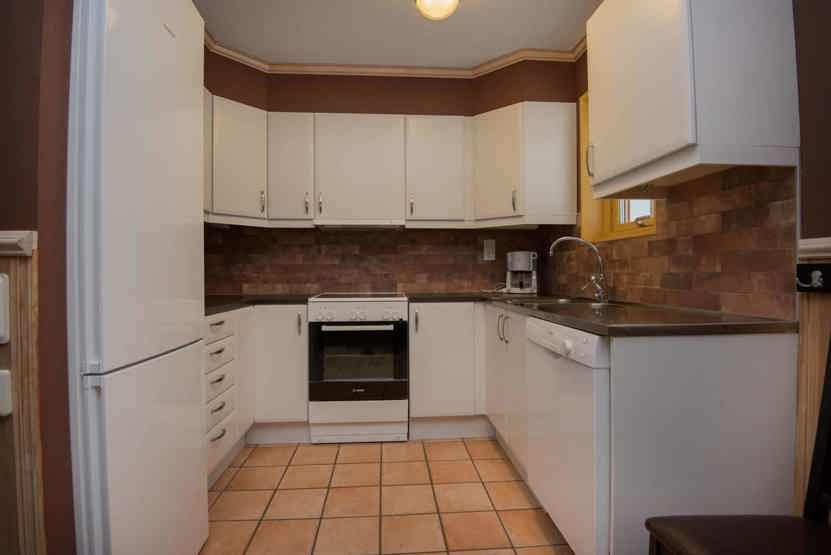 Køkkenet indeholder: elkomfur med ovn, køleskab, frys, opvaskemaskine, microovn.