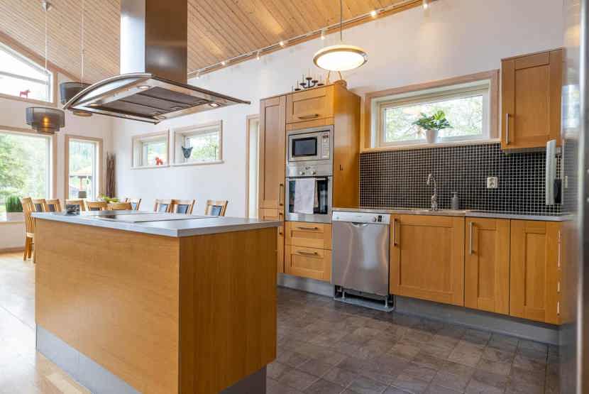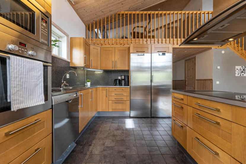 Køkkenet indeholder: elkomfur med ovn, køleskab, frys, opvaskemaskine, microovn.