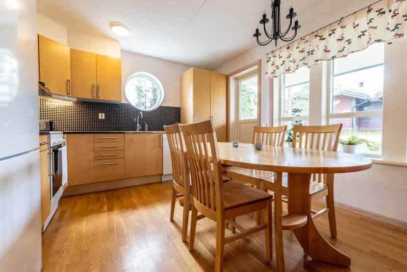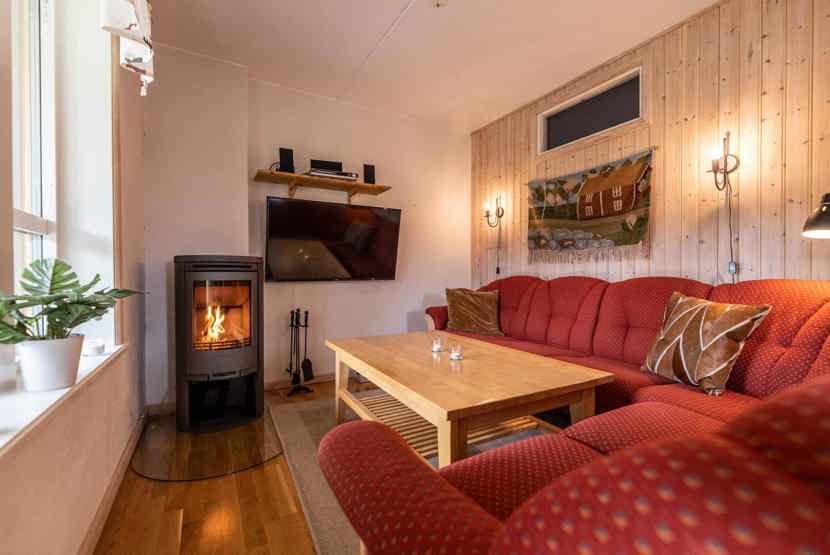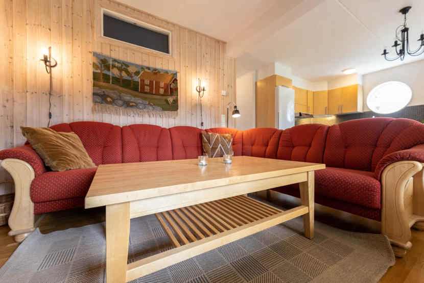 Opholdsstue med køkkenafdeling. TV, brændeovn (brænde indgår ikke), 1 højstol, 1 barneseng, tørreskab, rum til skiudstyr, altan (skovles ikke).