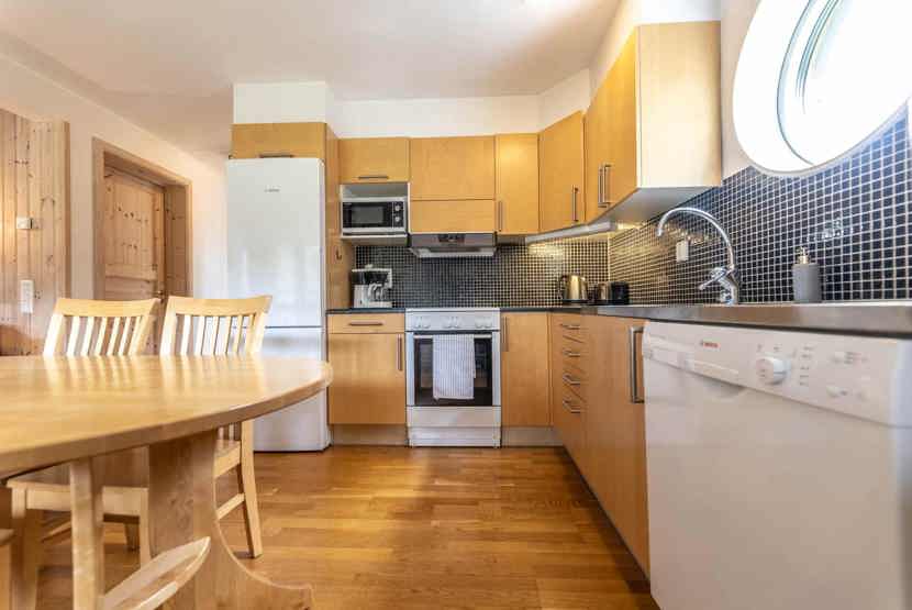 Køkkenet indeholder: elkomfur med ovn, køleskab, frys, opvaskemaskine, microovn.