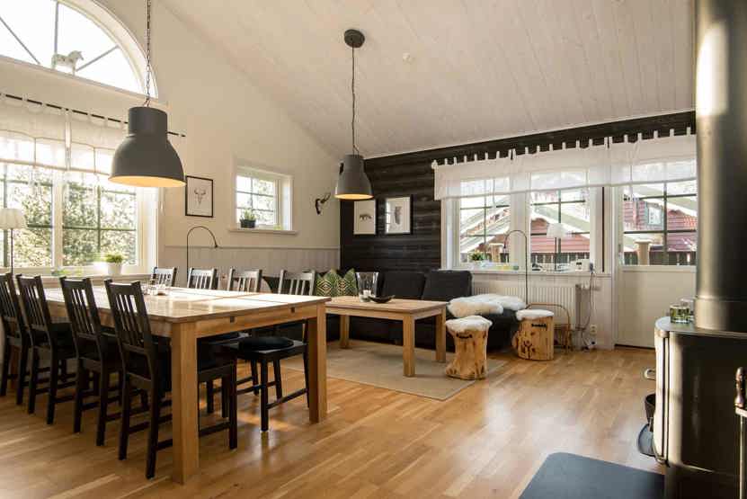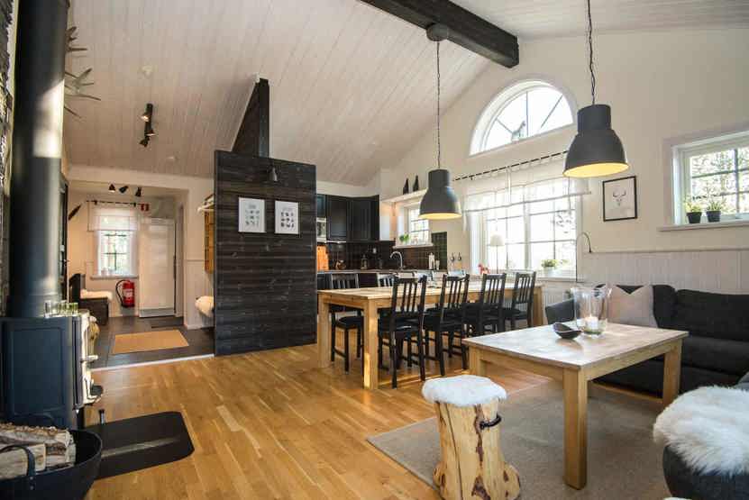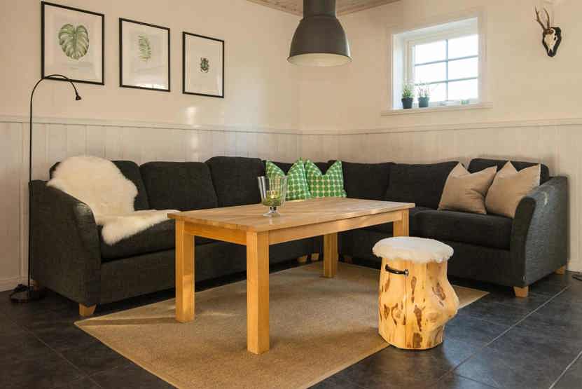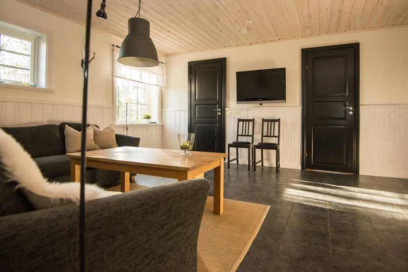Opholdsstue med køkkenafdeling, og opholdsstue på nedre etage.