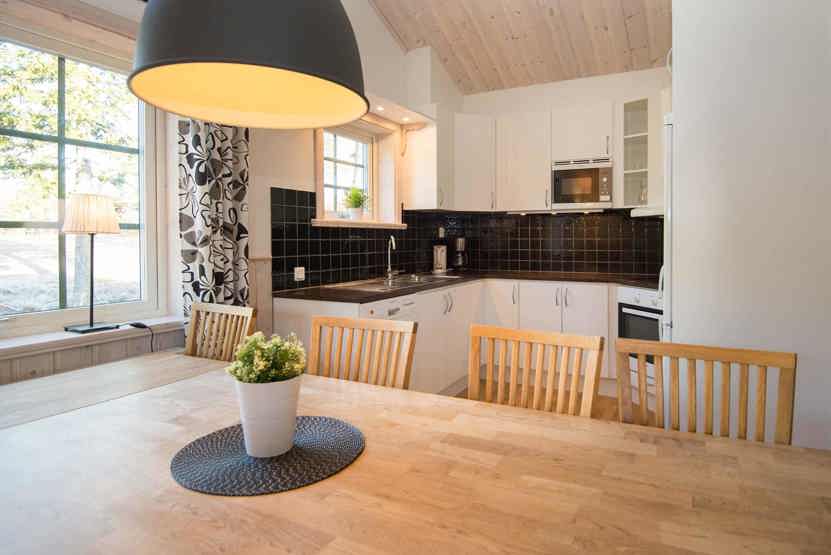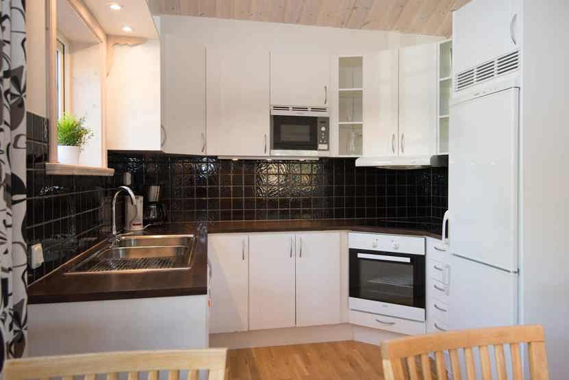 Køkkenet indeholder: elkomfur med ovn, køleskab, frys, opvaskemaskine, microovn.