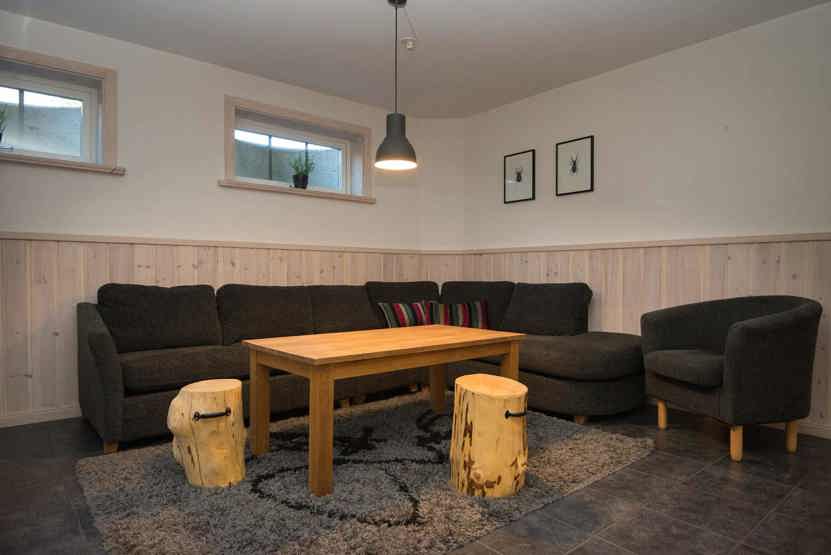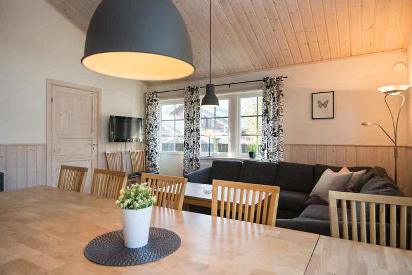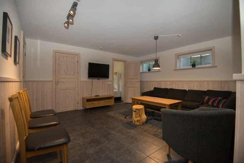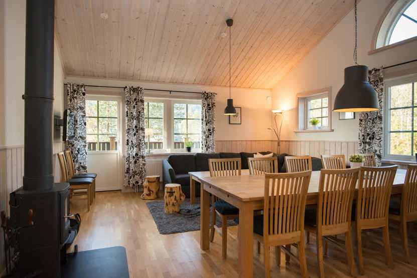 Opholdsstue med køkkenafdeling, og opholdsstue på nedre etage. TV, brændeovn (brænde indgår ikke), tørreskab, balkon.