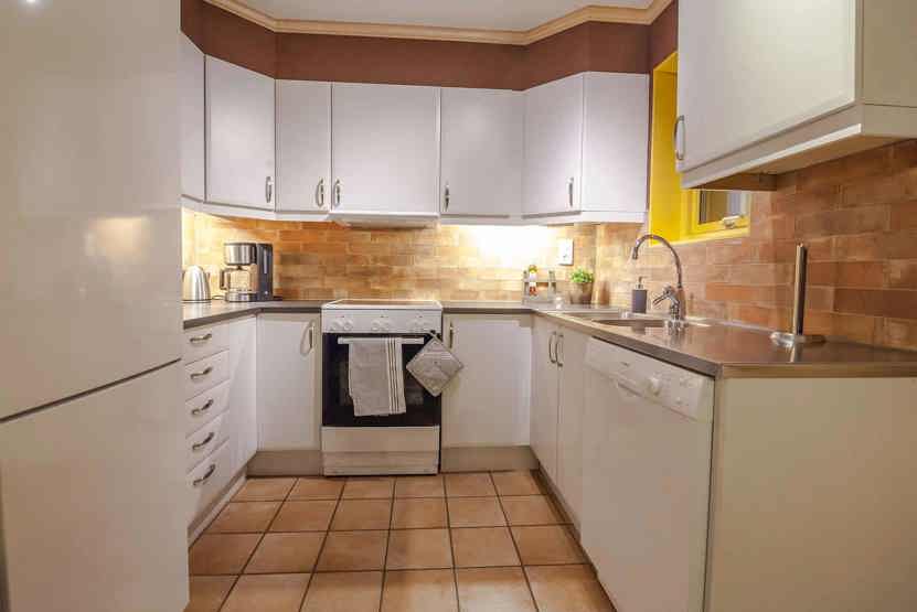 Køkkenet indeholder: elkomfur med ovn, køleskab, frys, opvaskemaskine, microovn.