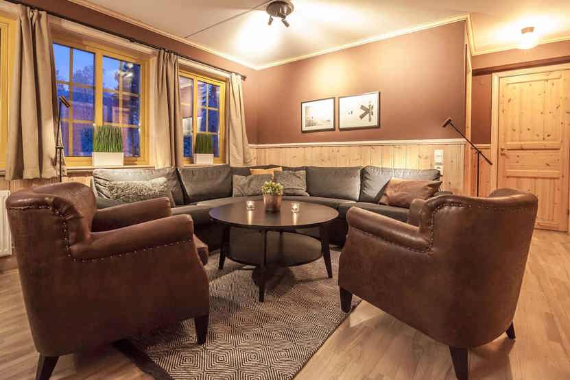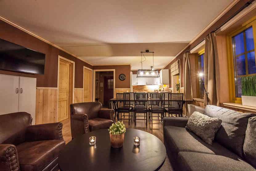 Opholdsstue med køkkenafdeling. TV, tørreskab, rum til skiudstyr.