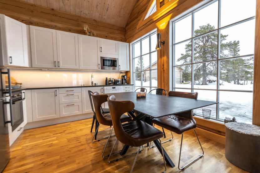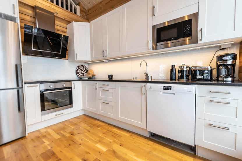Køkkenet indeholder: Kogeplade med induktion, indbygningsovn, køleskab, frys, opvaskemaskine, microovn.