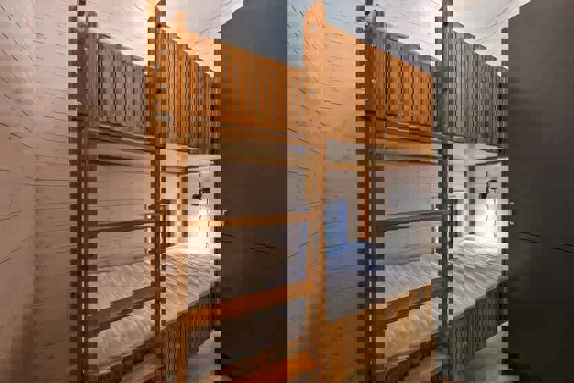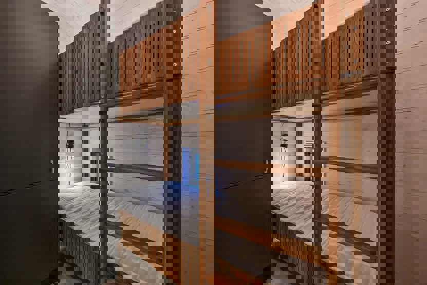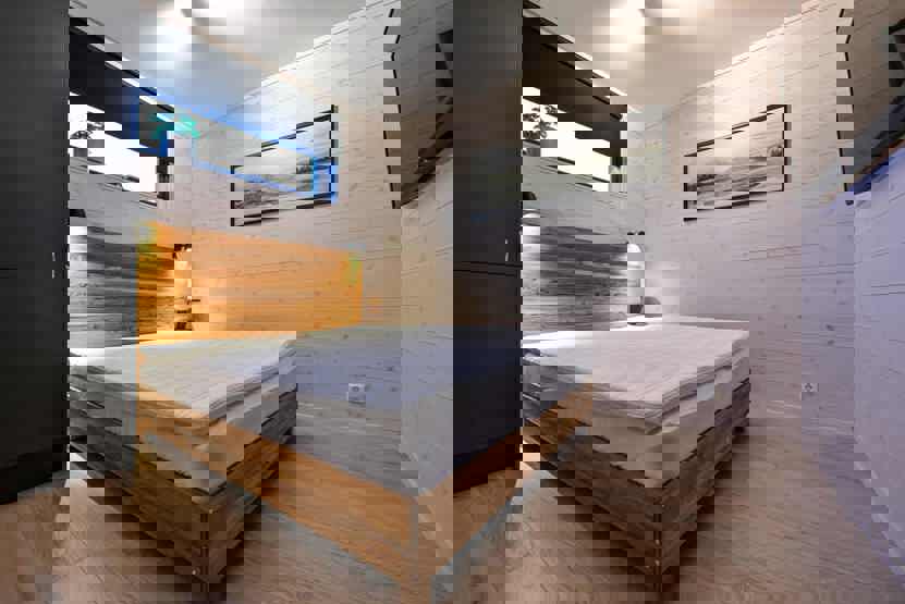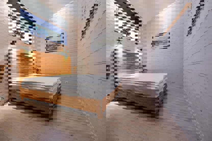 Soveværelse-1= 1 dobbeltseng 160 cm bred. Soveværelse-2= 1 dobbeltseng 160 cm bred. Soveværelse-3= 1 køjeseng hvor både over og underkøje er 90 cm bred. Soveværelse-4= 1 køjeseng hvor både over og underkøje er 90 cm bred. Soveværelse-5= 1 køjeseng hvor både over og underkøje er 90 cm bred.