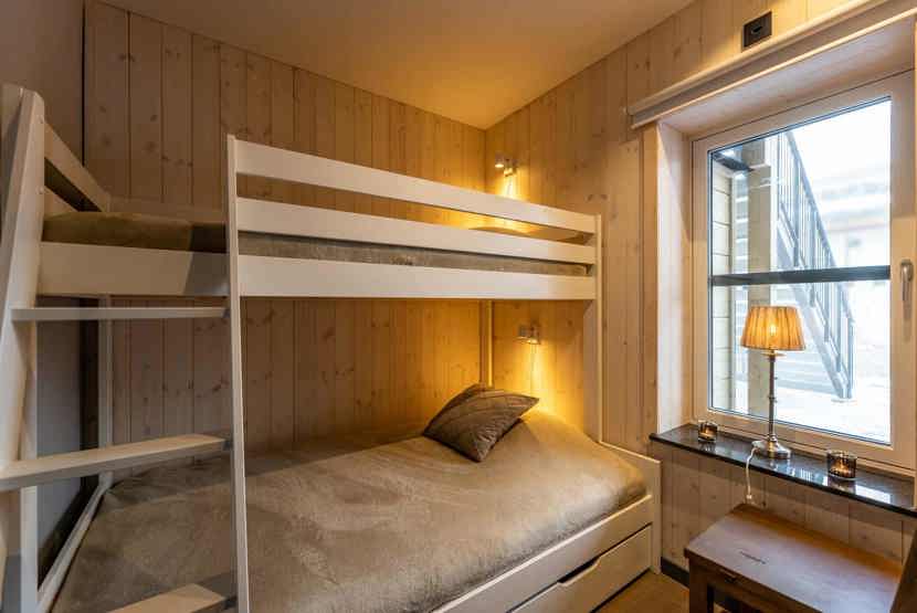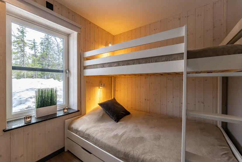 Soveværelse-1= 1 dobbeltseng. Soveværelse-2= 1 køjeseng med 120 cm bred underkøje . Soveværelse-3= 1 køjeseng med 120 cm bred underkøje .