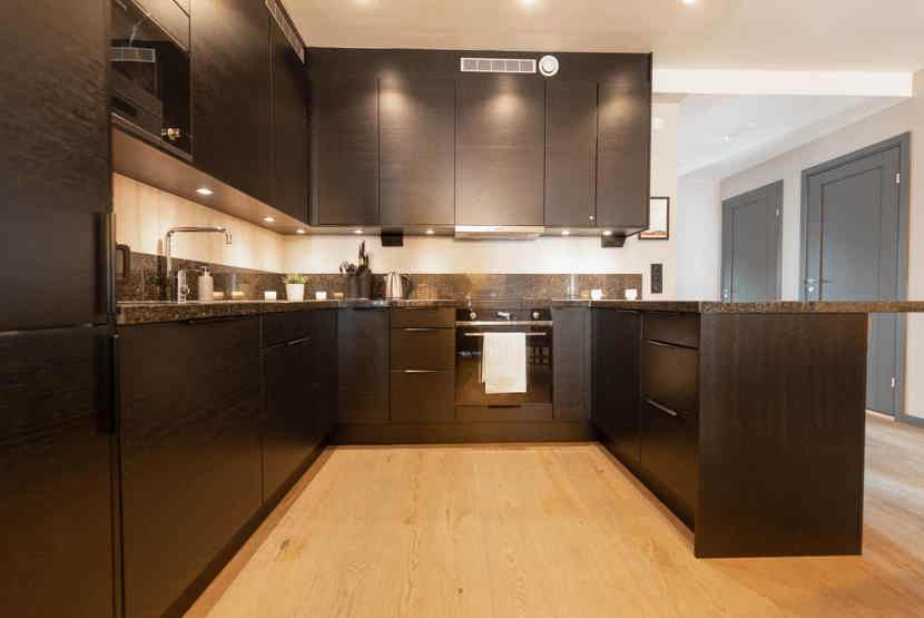 Køkkenet indeholder: elkomfur med ovn, køleskab, frys, opvaskemaskine, microovn.