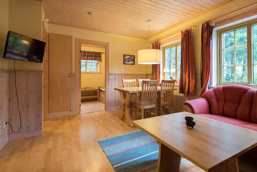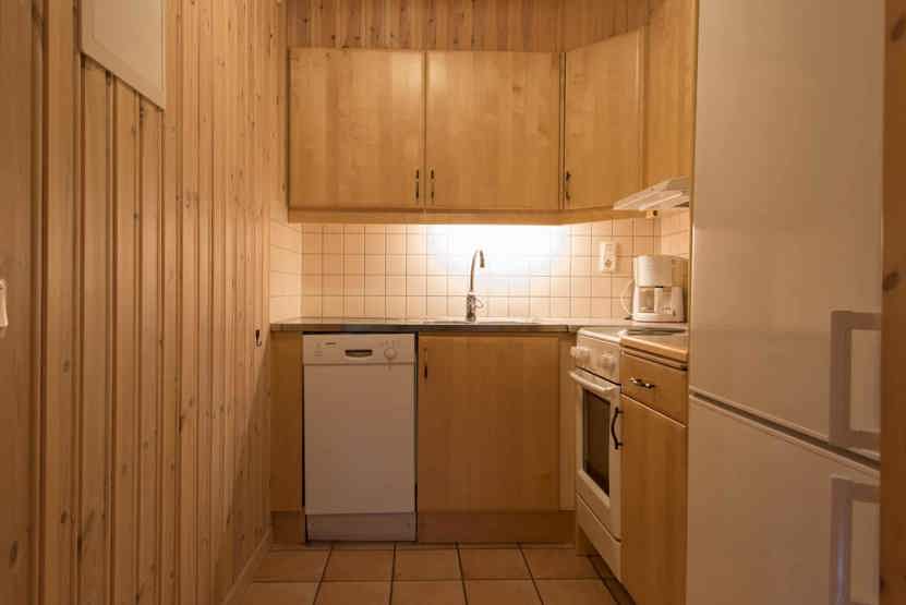 Opholdsstue med køkkenafdeling. TV, tørreskab, rum til skiudstyr, 1 barneseng, 1 højstol.