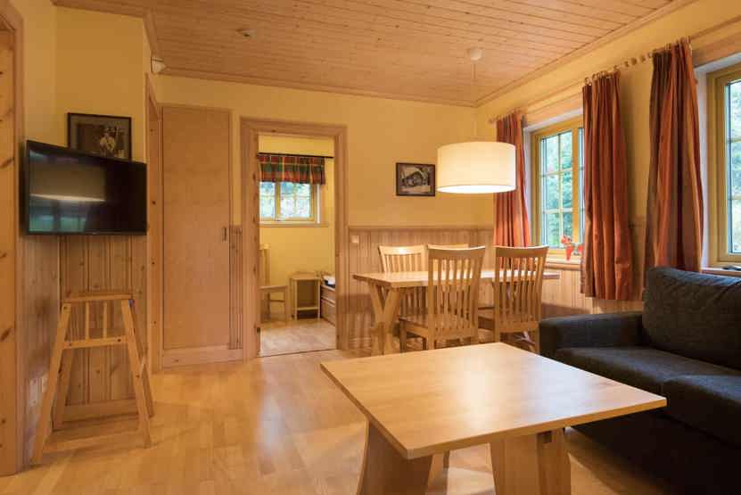 Opholdsstue med køkkenafdeling. TV, tørreskab, rum til skiudstyr, 1 barneseng, 1 højstol.