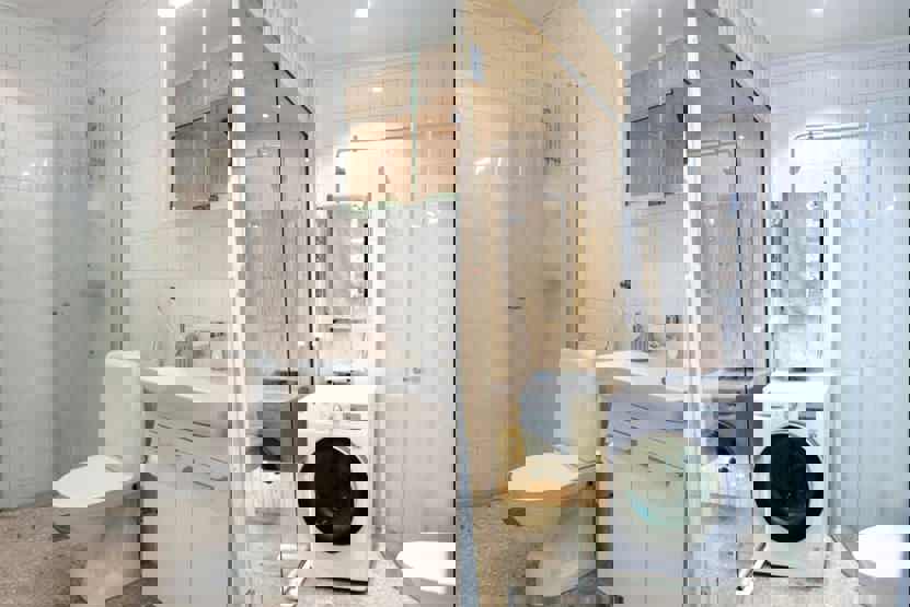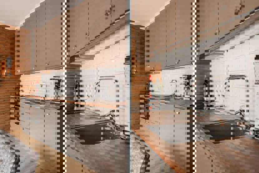 Køkkenet indeholder: keramiske kogeplader, kombiugn med microovn, opvaskemaskine, køleskab, frys.