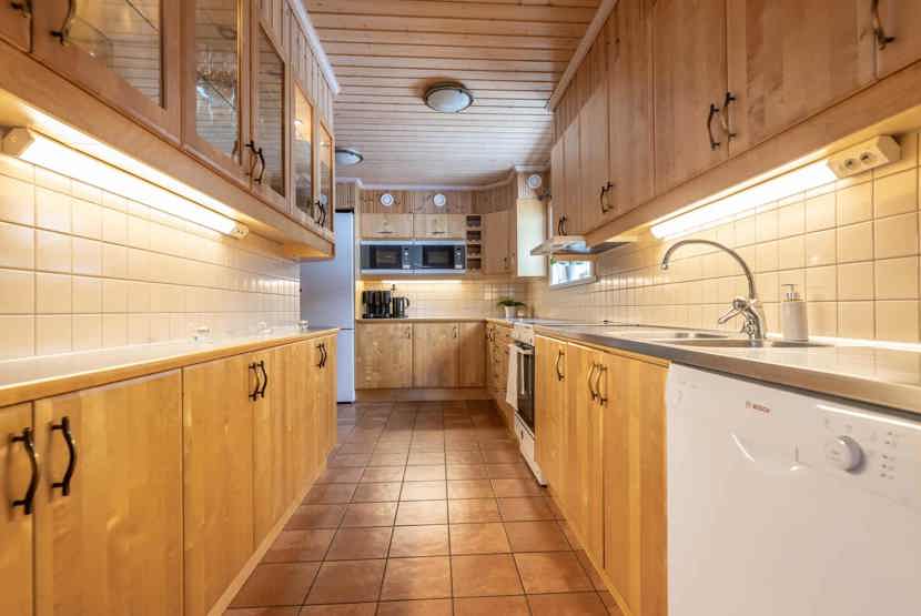 Køkkenet indeholder: elkomfur med ovn, microovn, opvaskemaskine, køleskab, frys.