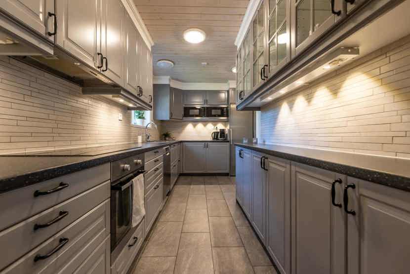 Køkkenet indeholder: keramiske kogeplader med ovn, microovn, opvaskemaskine, køleskab, frys.