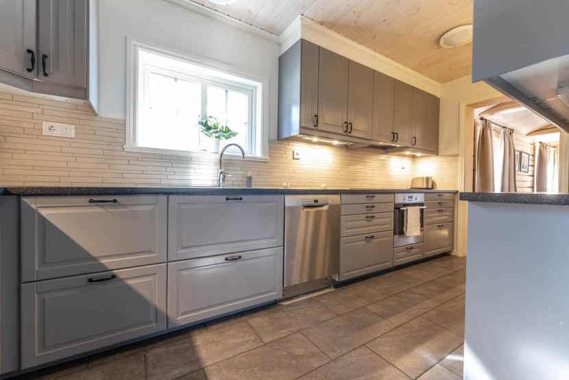 Køkkenet indeholder: keramiske kogeplader med ovn, microovn, opvaskemaskine, køleskab, frys.