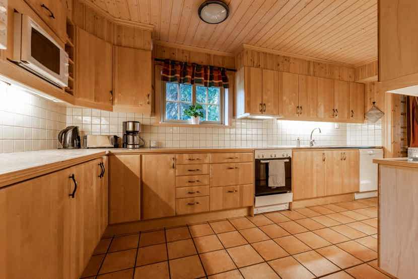 Køkkenet indeholder: elkomfur med ovn, microovn, opvaskemaskine, køleskab, frys.