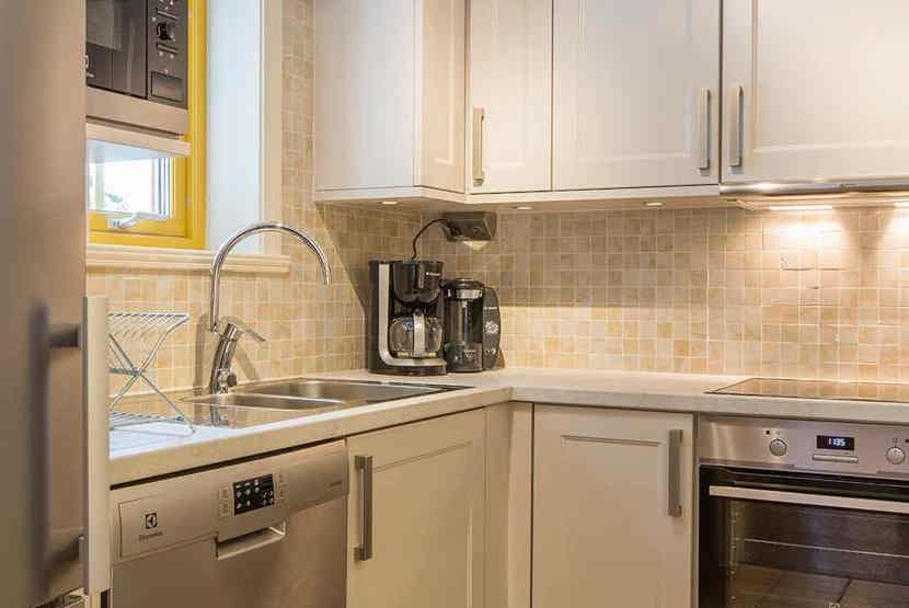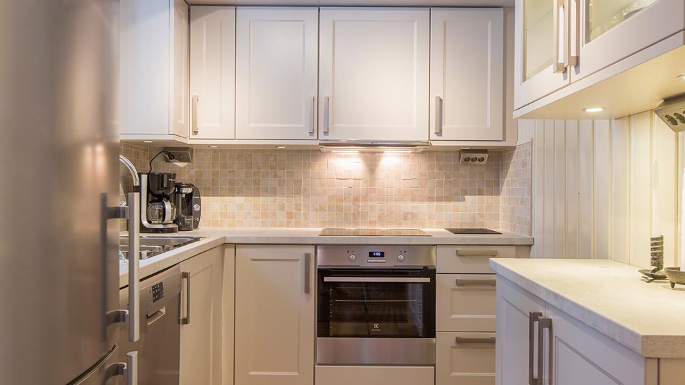 Køkkenet indeholder: elkomfur med ovn, microovn, opvaskemaskine, køleskab, frys.