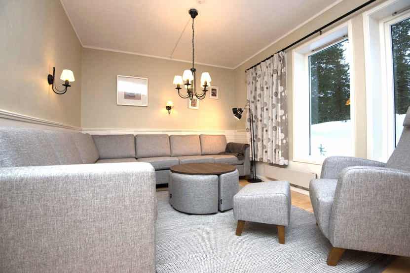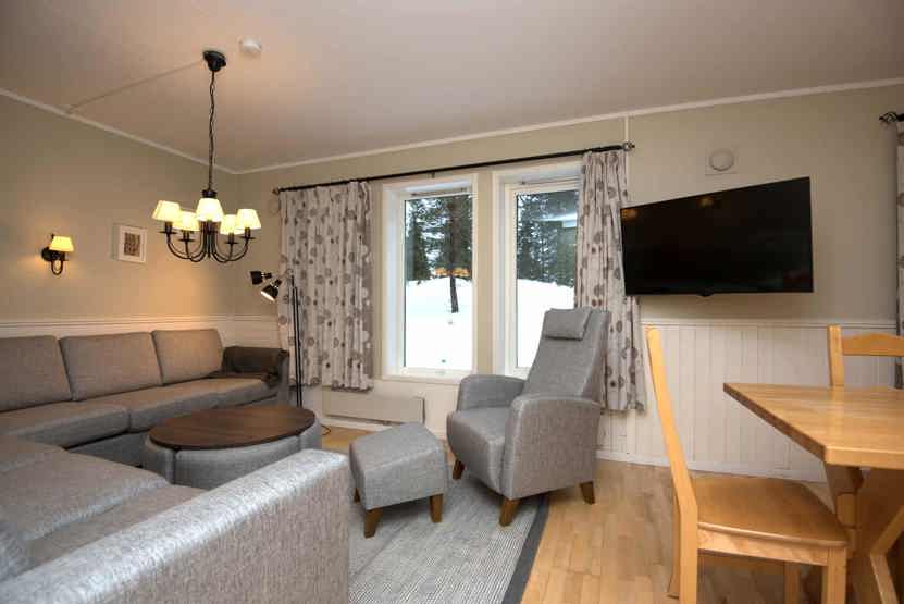 Opholdsstue med køkkenafdeling. TV, tørreskab, rum til skiudstyr.