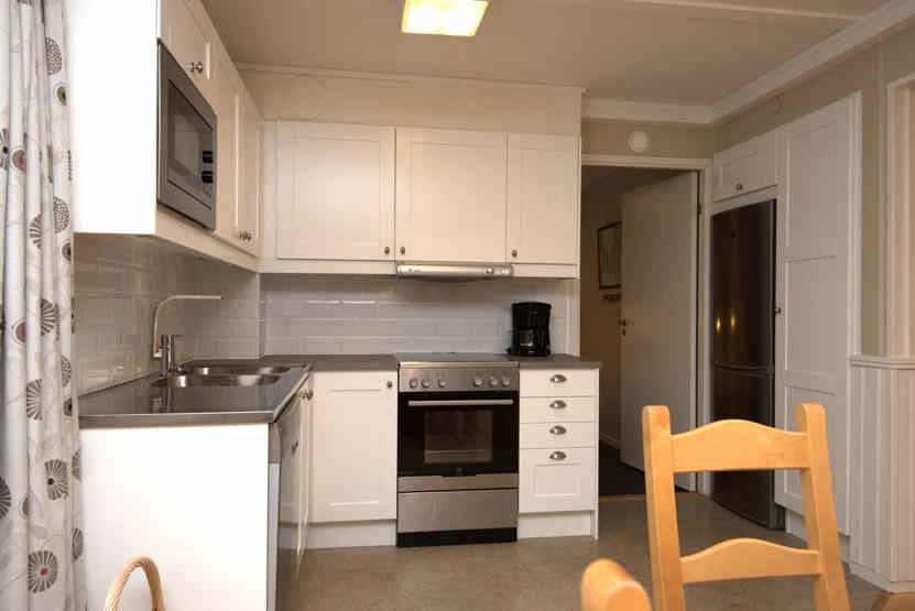 Køkkenet indeholder: elkomfur med ovn, køleskab, frys, microovn, opvaskemaskine.