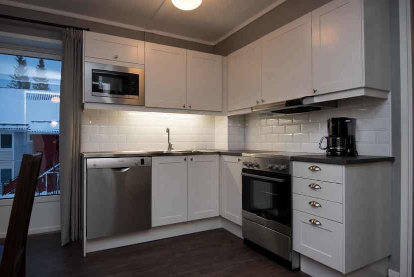 Køkkenet indeholder: elkomfur med ovn, køleskab, frys, microovn, opvaskemaskine.